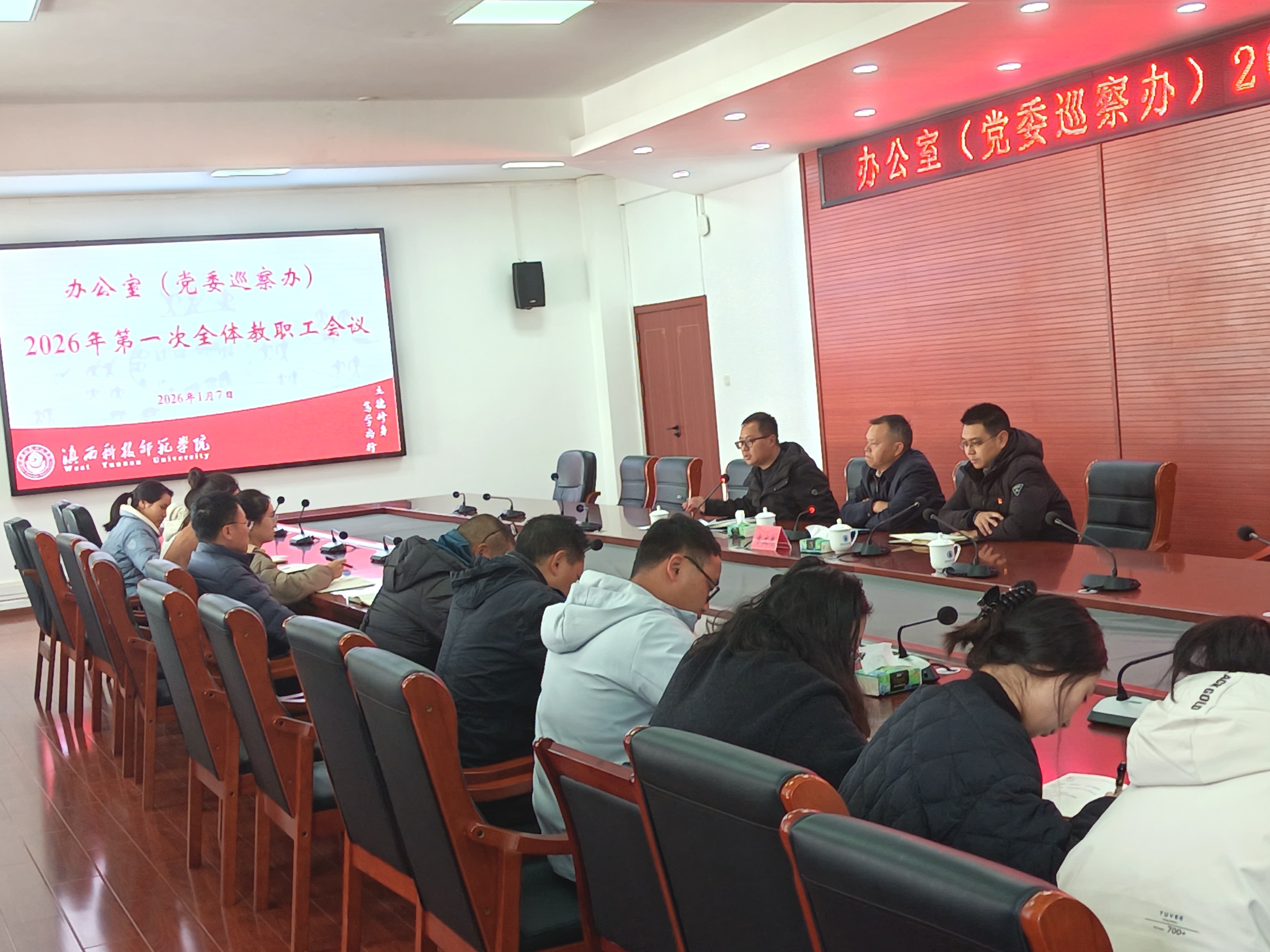 2026年1月7日,办公室(党委巡察办)召开第一次教职工会议,研究部署办公室2026年党风廉政建设工作,会议由办公室(党委巡察办)主任、体育与健康学院(公共体育教学部)党总支书记字文忠主持。